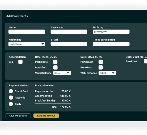 First, we needed to create an entirely new database, defining precise data entries to accommodate the specific needs of their organisation. This included accounting for unique details like differentiating between single and group registrations and implementing a payment system seamlessly integrated into the tool.
