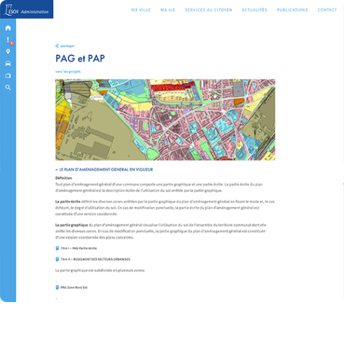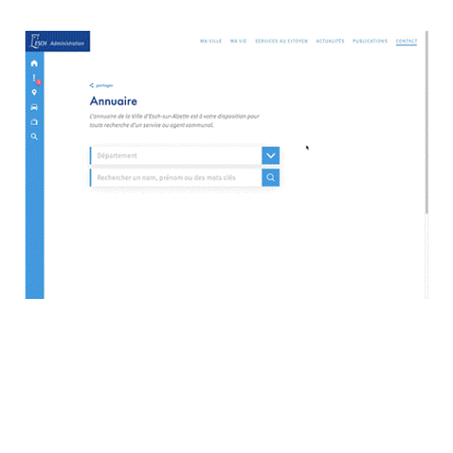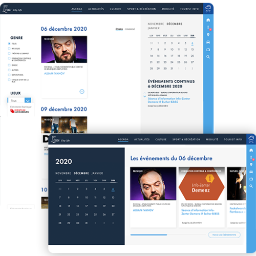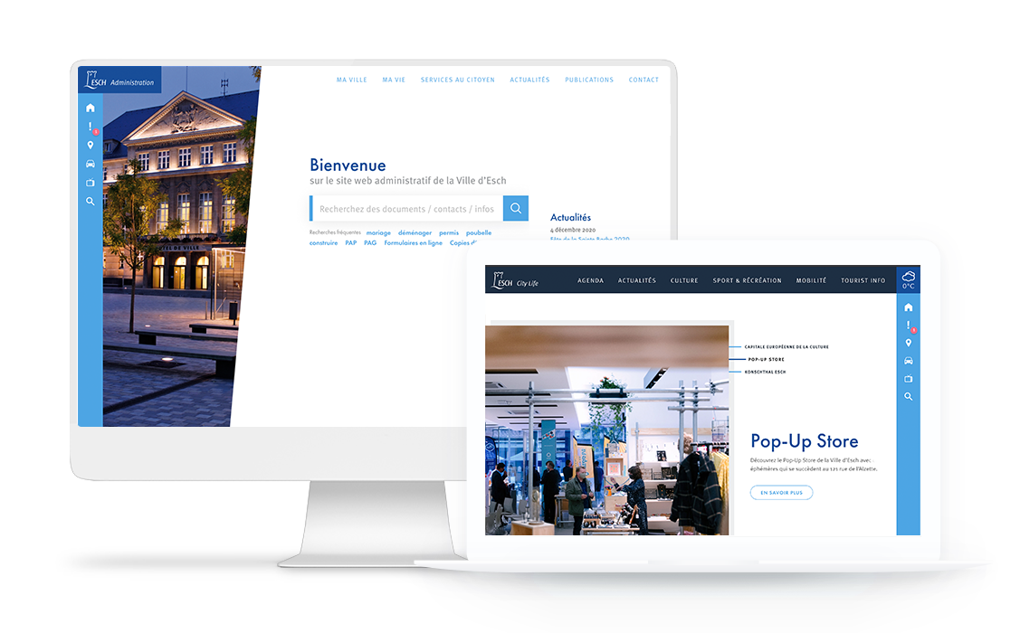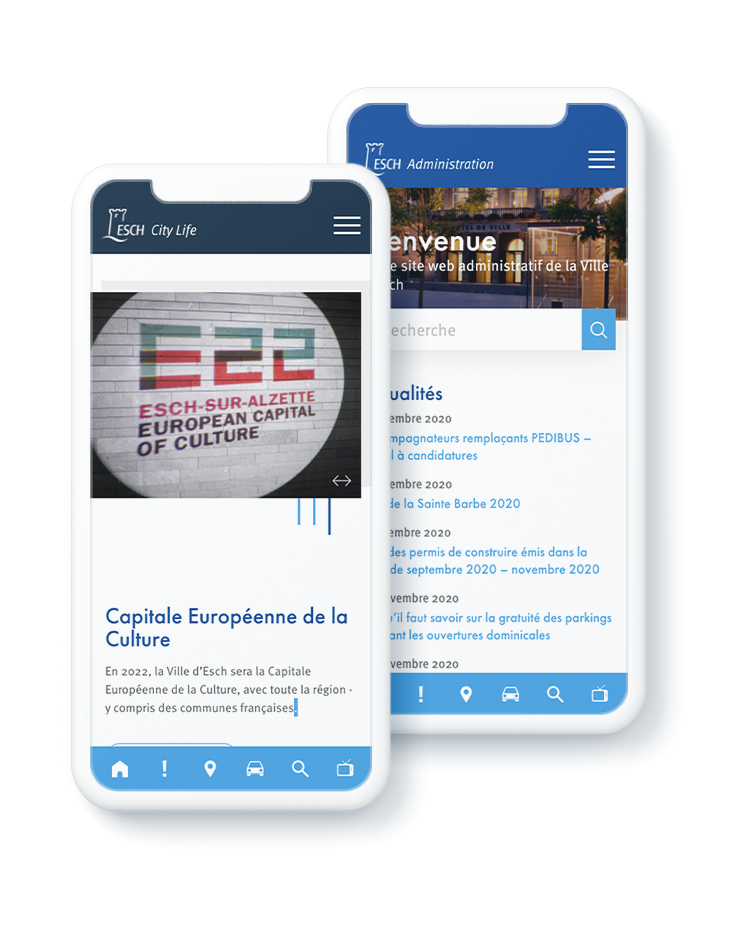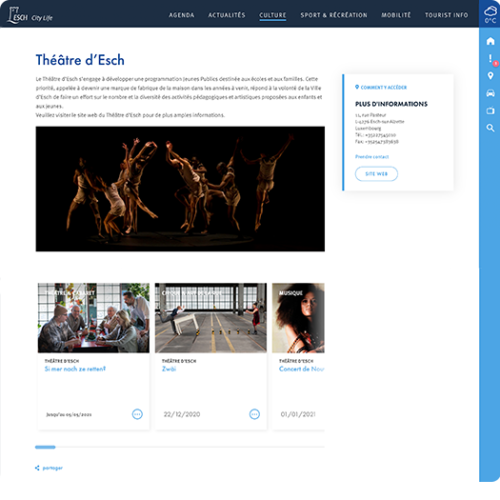 A local resident, who is looking for contact numbers or very specific documents,has different needs than a person who wants to know what he could do in Esch-sur-Alzette while on a visit. Two sites with different content and looks, linked by a common landing page and a sidebar that gives the user the possibility to get back to the main homepage’s information in the form of panels.